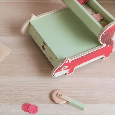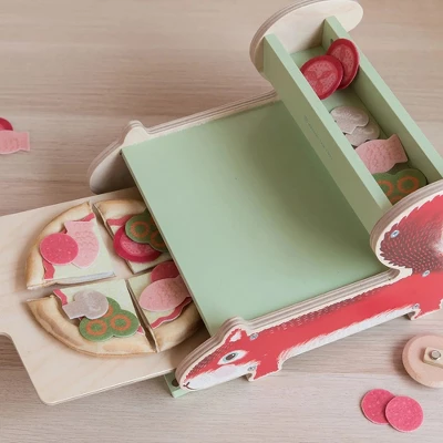 - HANDS-ON ANIMAL SHAPE WOODEN ACTIVITY TOY: The Nutty Squirrel Pizzeria wooden kitchen playset and accessory features a squirrel-shaped oven, a wood paddle, wooden pizza cutter, felt pizza crust quarters, sauce with cheese, and toppings that mimic real pizza qualities. Wooden activity toy is versatile for solitary or associative play patterns.